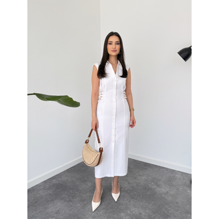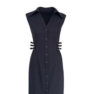 فستان ساتان بفتحة رقبة على شكل حرف V مع تفاصيل إكسسوار على الخصر، لون كستنائي
