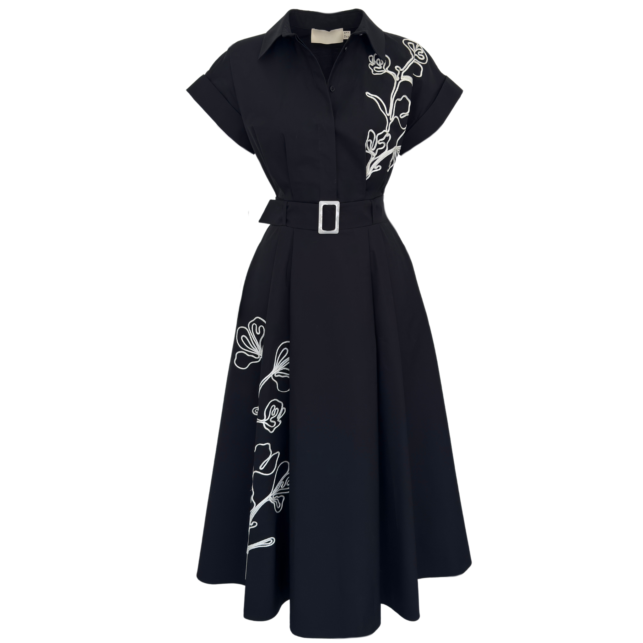 فستان قطني 100% مع تفاصيل تطريز، أسود