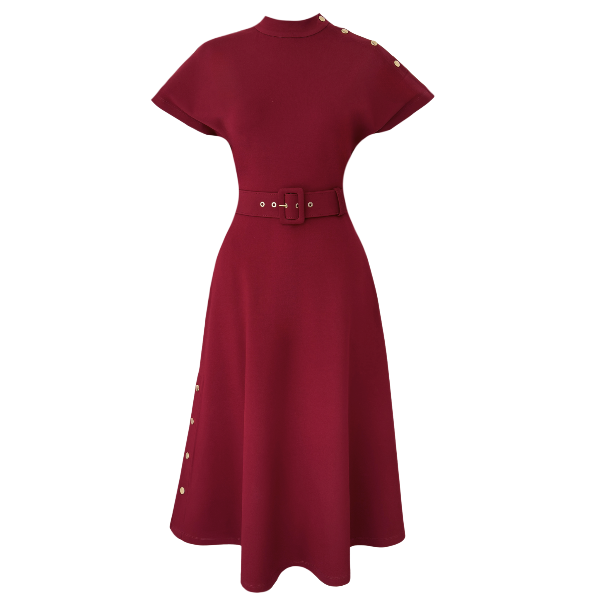 فستان كستنائي اللون مع أزرار ذهبية مفصلة على الكتف والتنورة