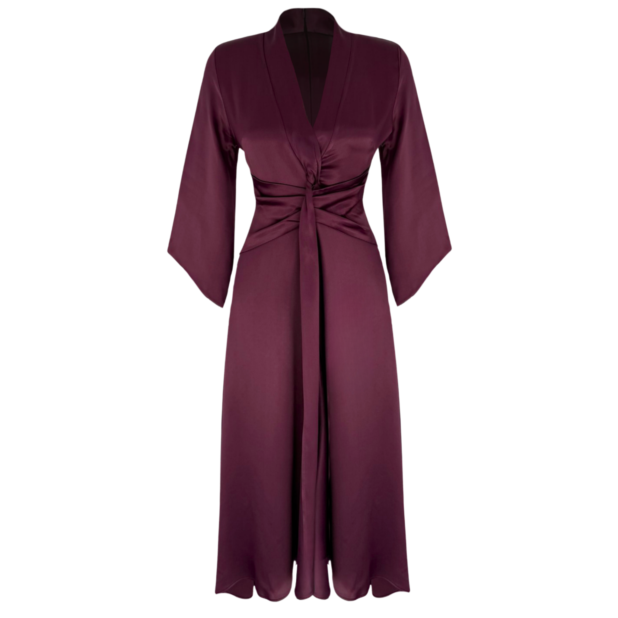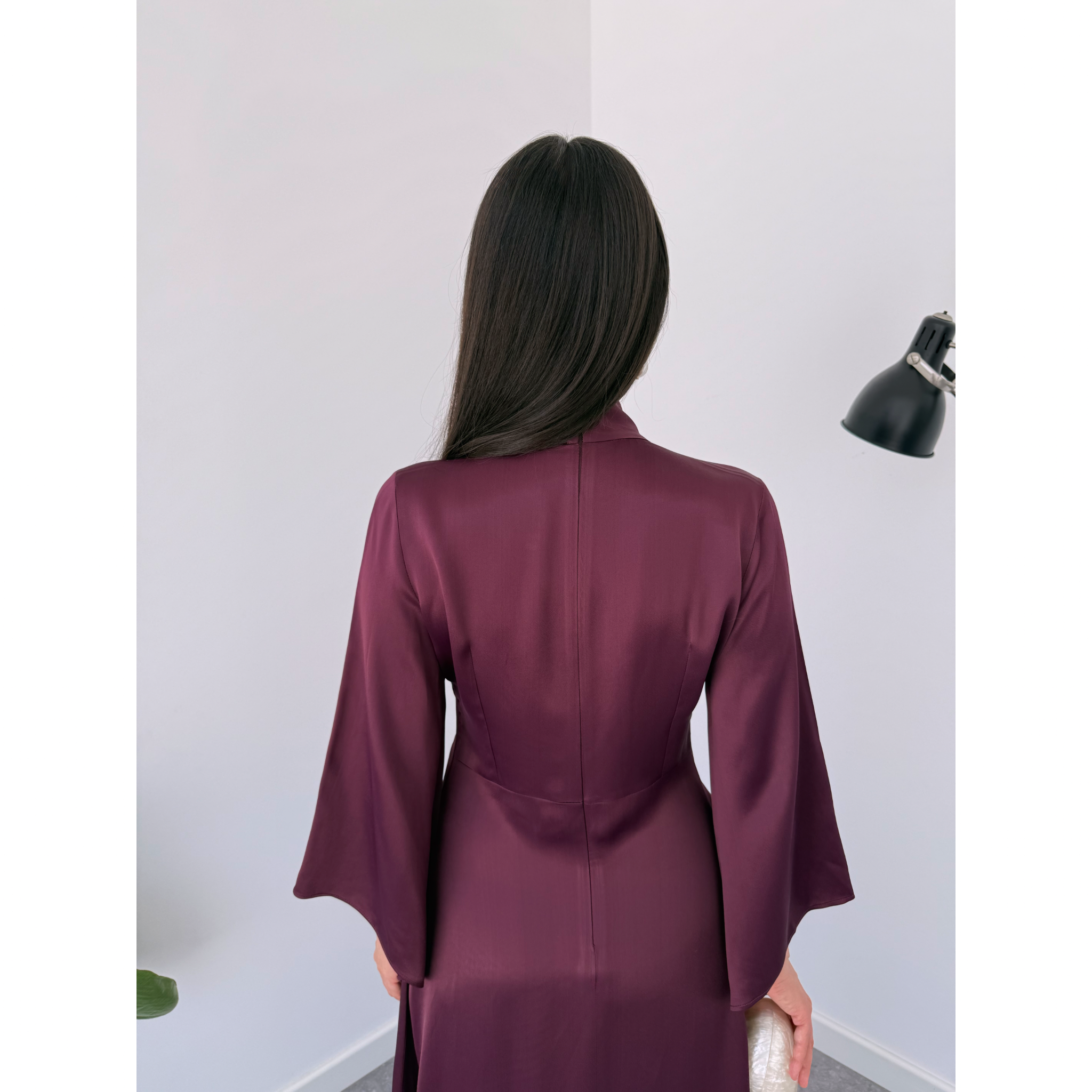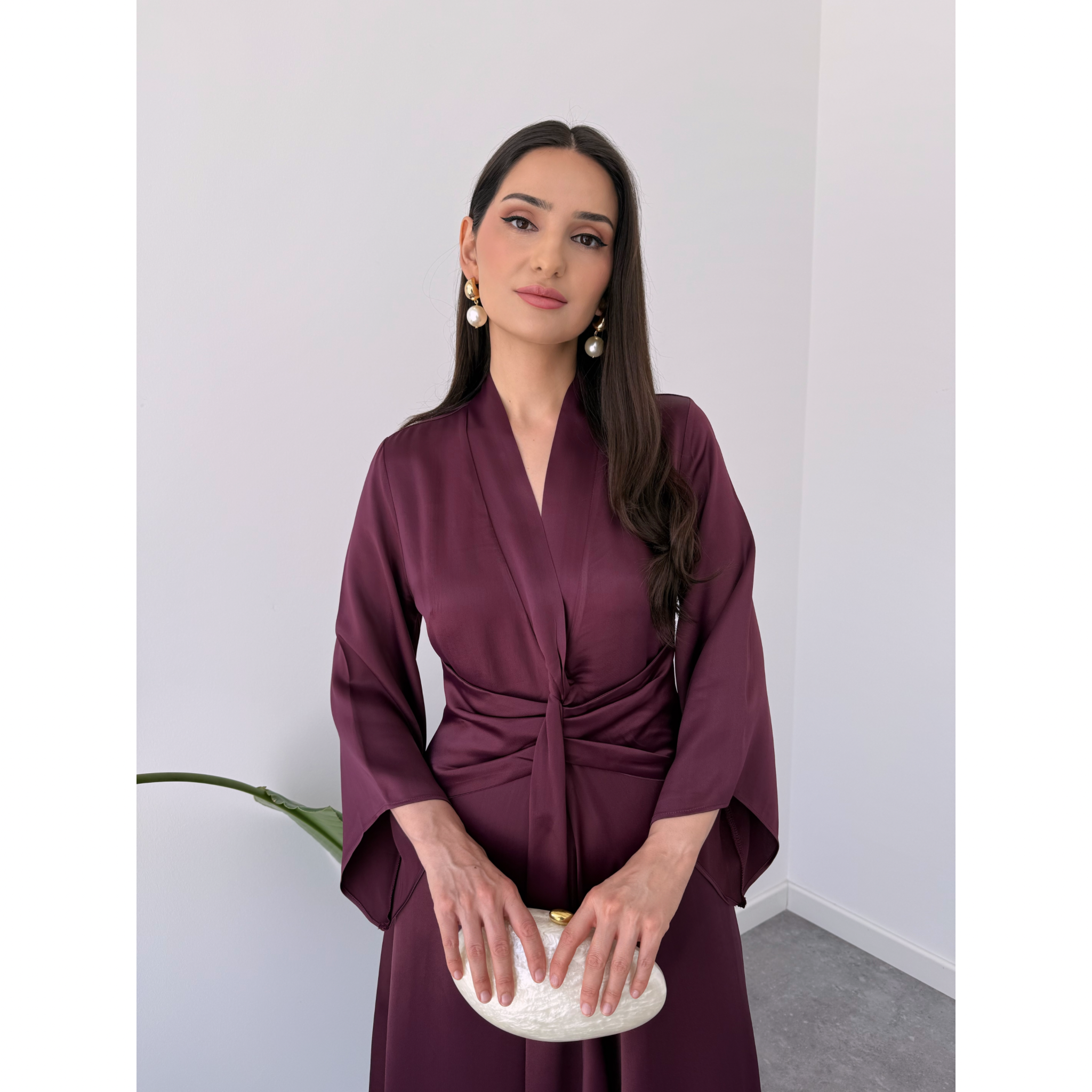 V YAKA BEL DETAY PAMUK SATEN ELBİSE BORDO