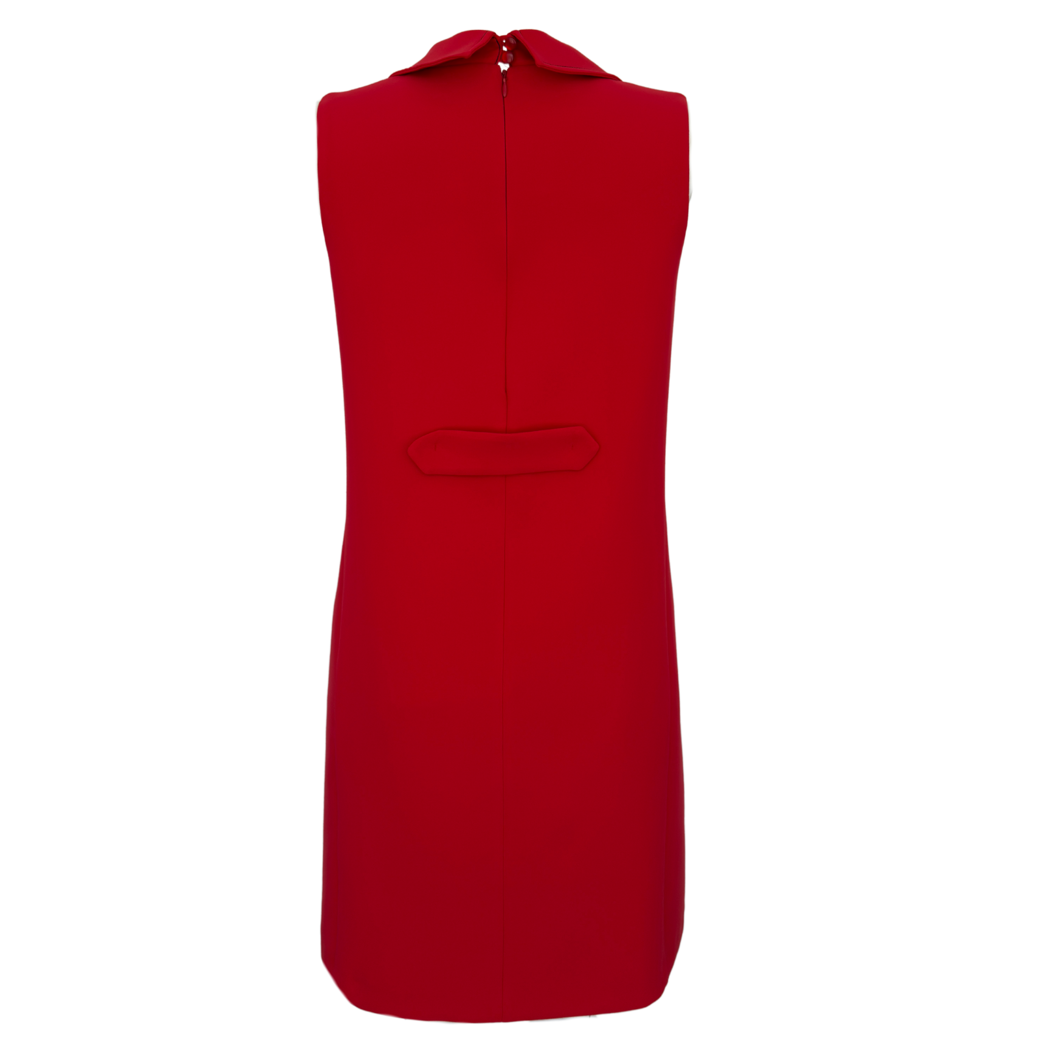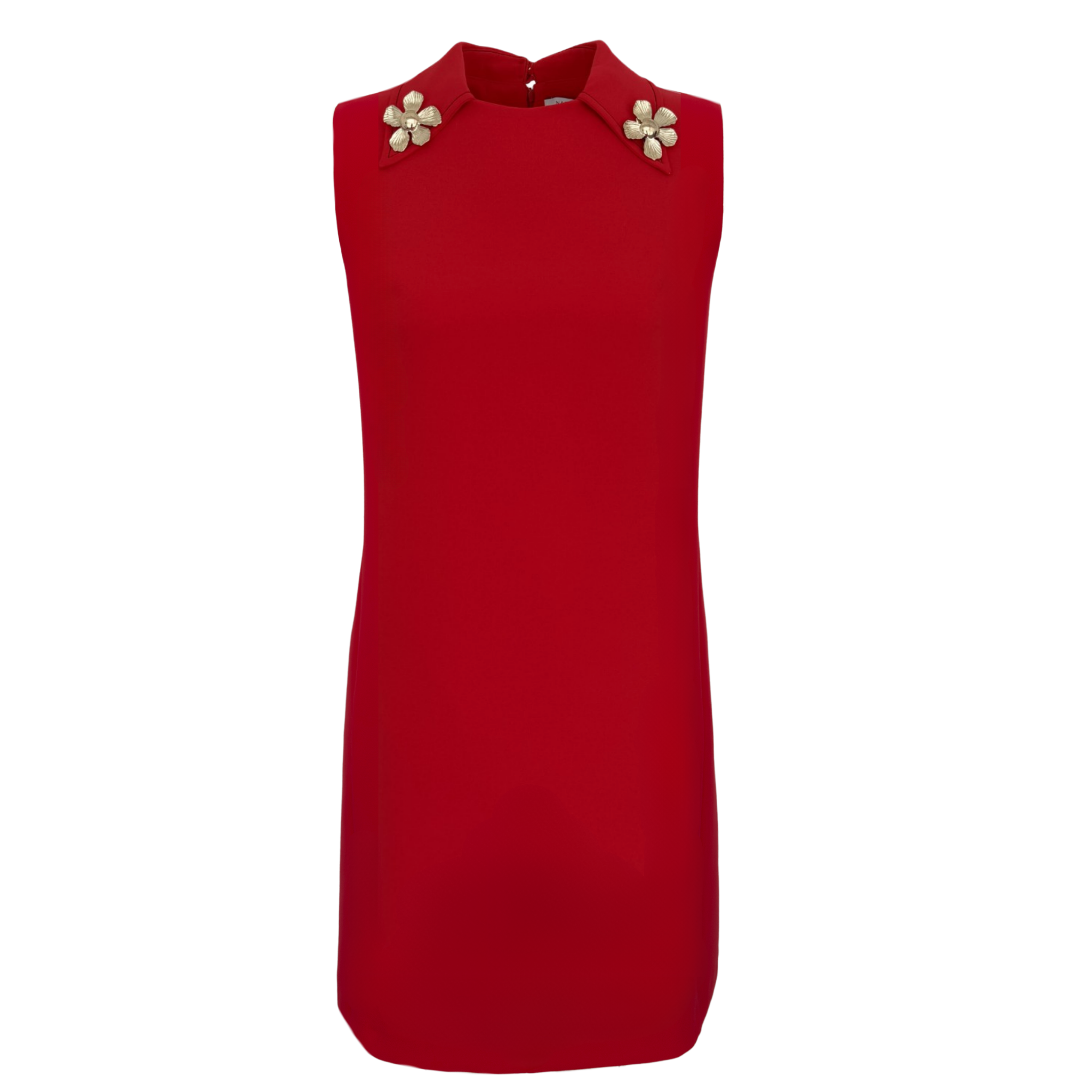 فستان أحمر مع طوق مفصل مزين بدبوس