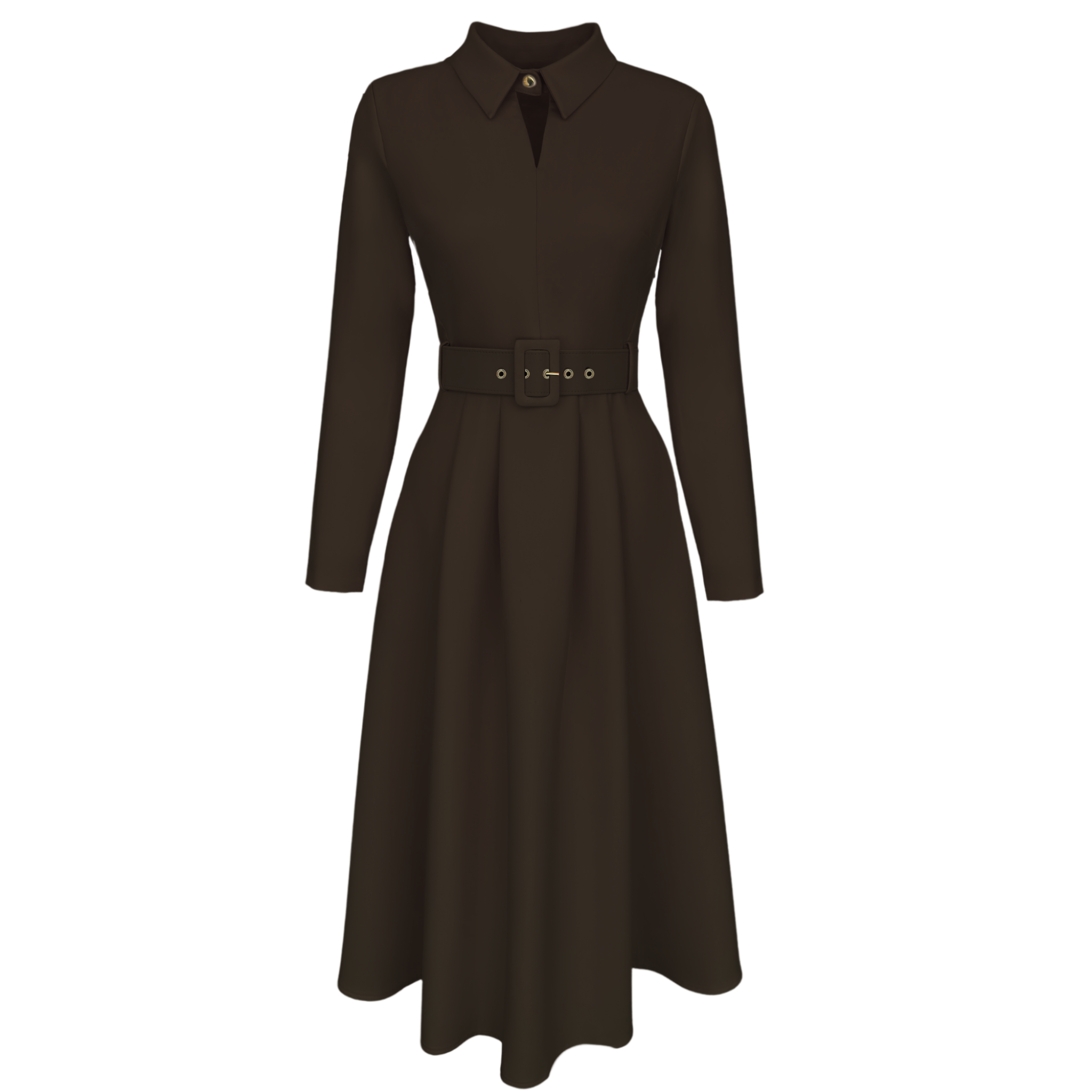 فستان بحزام وتفاصيل نافذة الياقة باللون البني