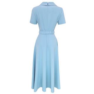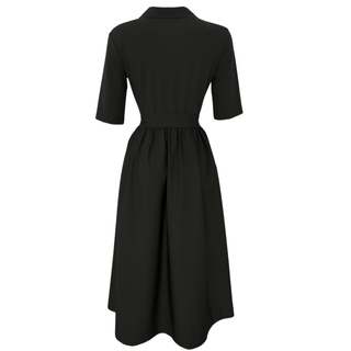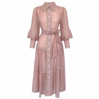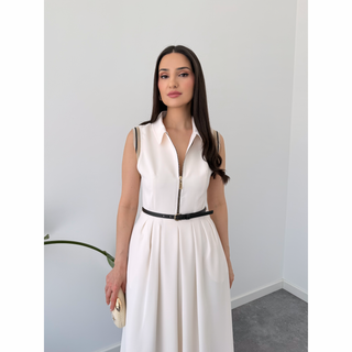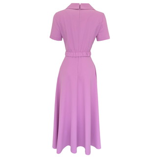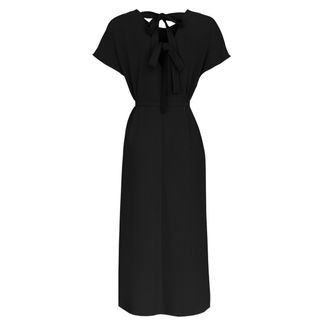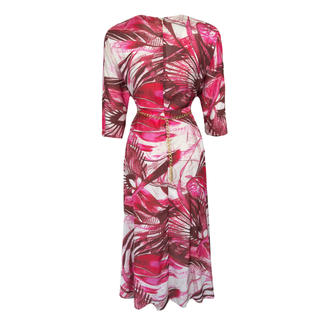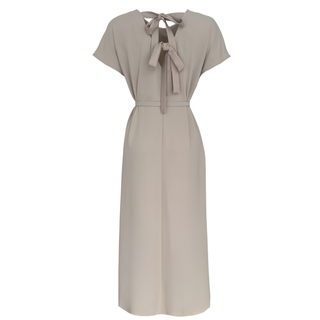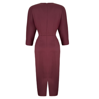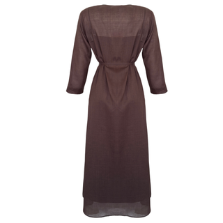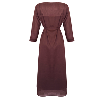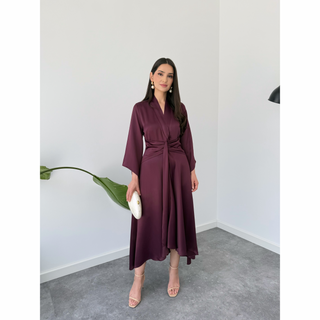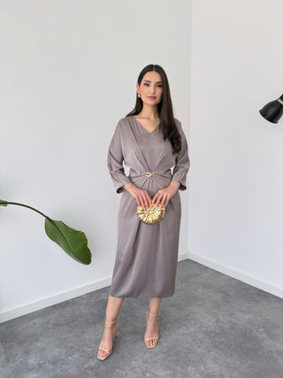 فستان ساتان بفتحة رقبة على شكل حرف V مع تفاصيل إكسسوار على الخصر، لون كستنائي