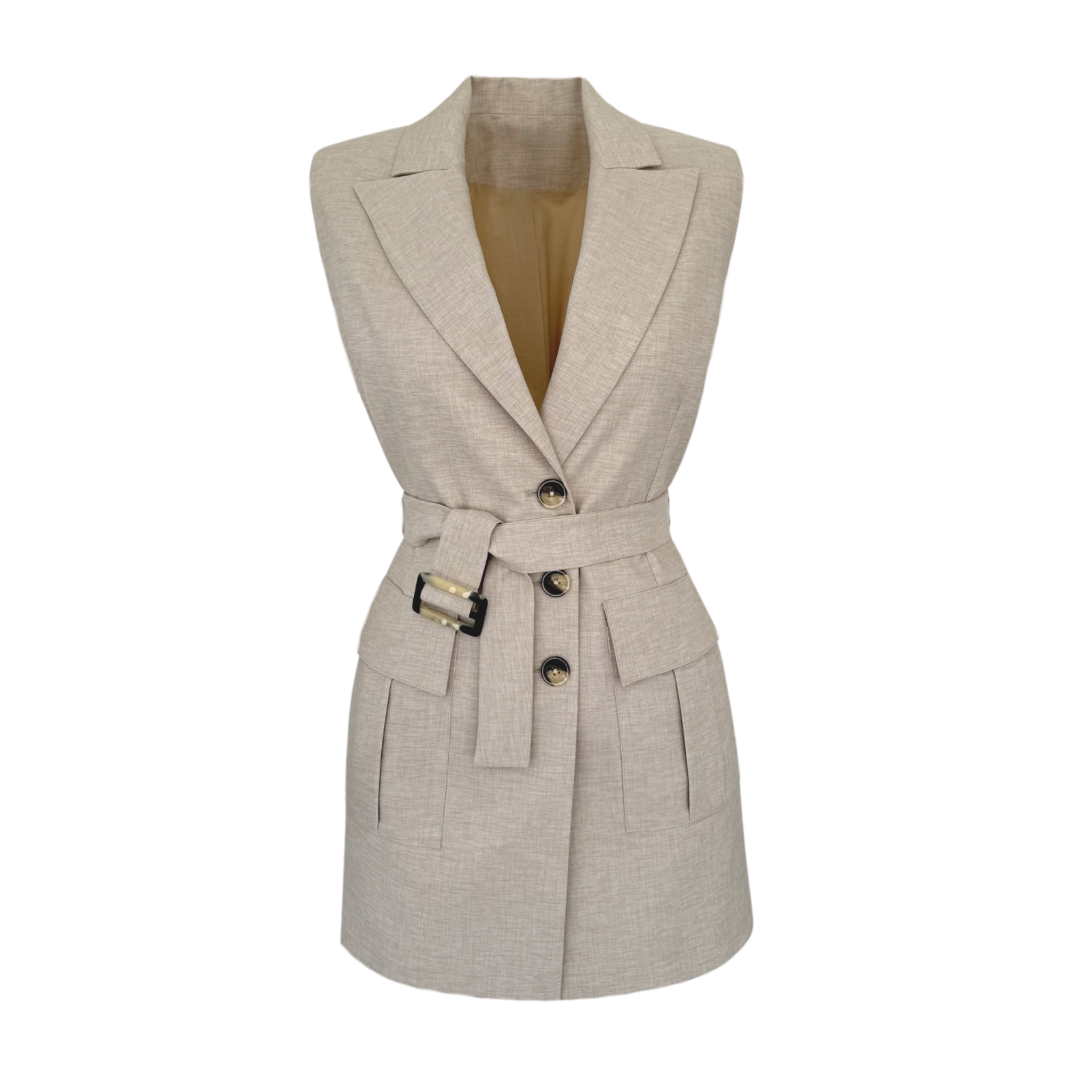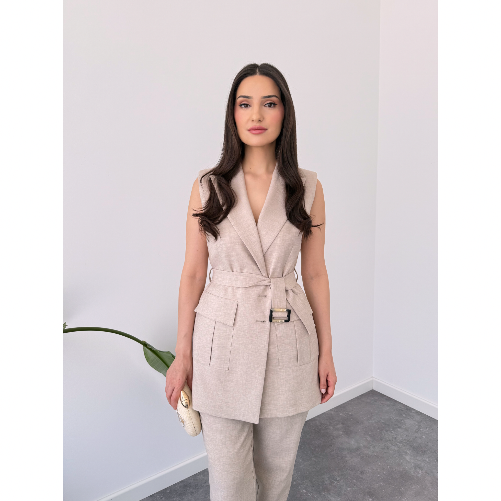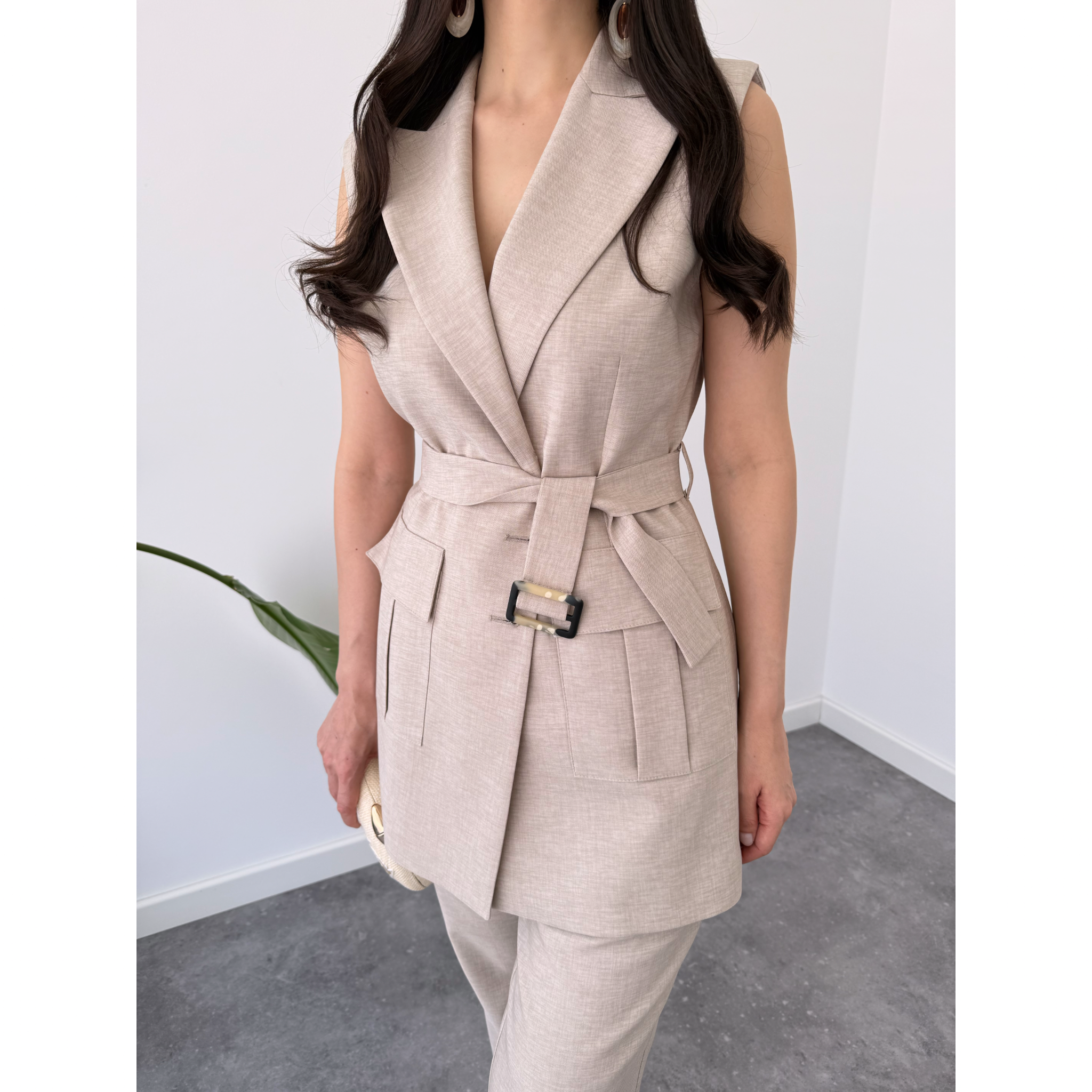 BELİ KUŞAKLI CEP DETAY YELEKLİ TAKIM