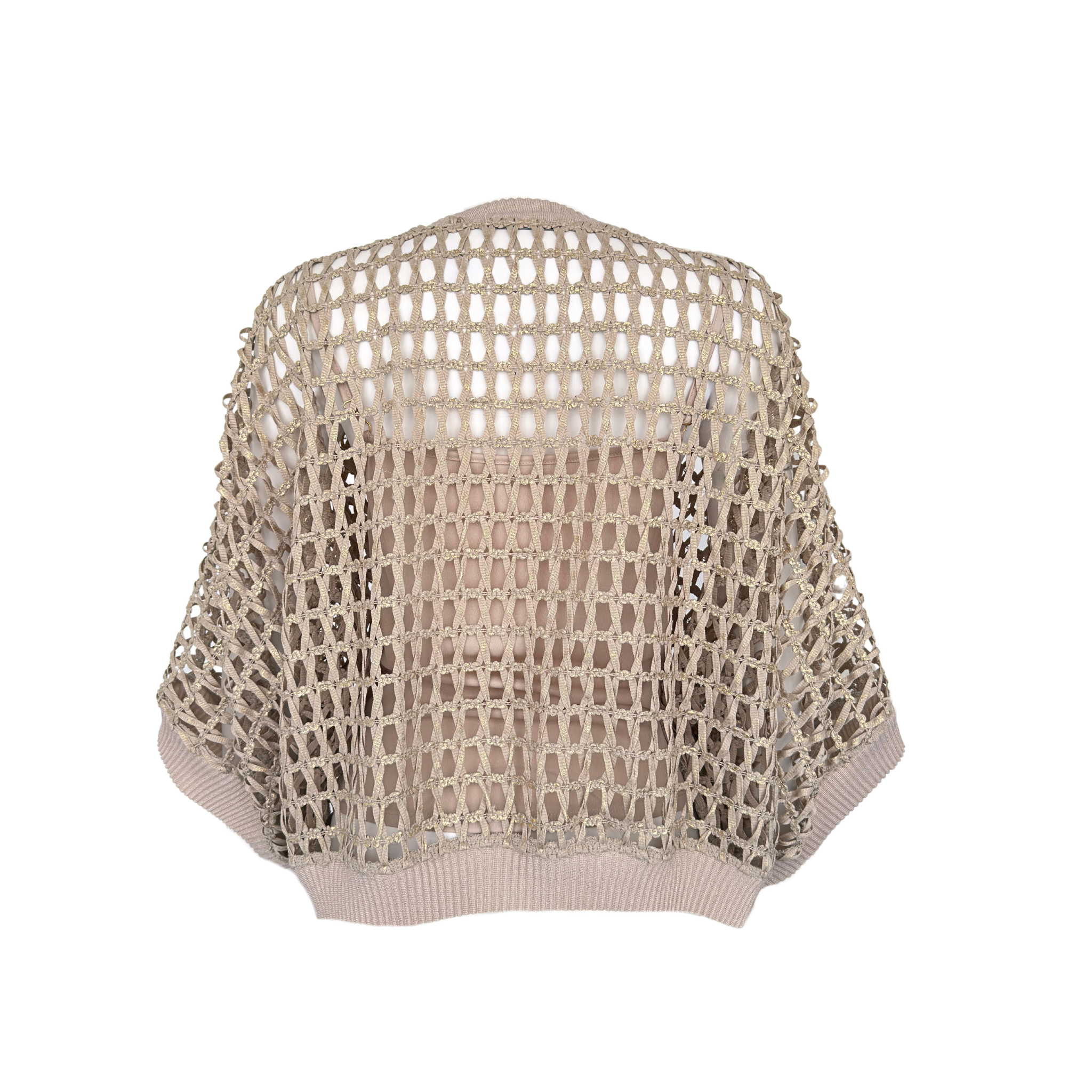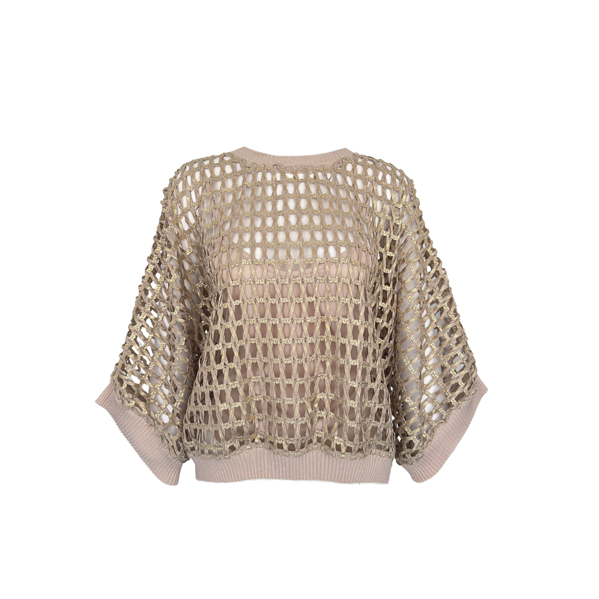 بلوزة شبكية كبيرة الحجم مطبوعة باللون الذهبي، لون بيج