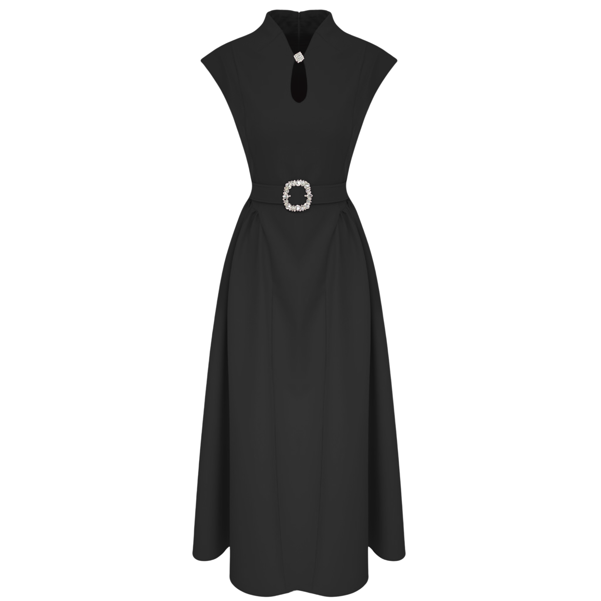 BLACK DRESS WITH STONE DETAIL ON THE BELT AND ACCENTRATION.