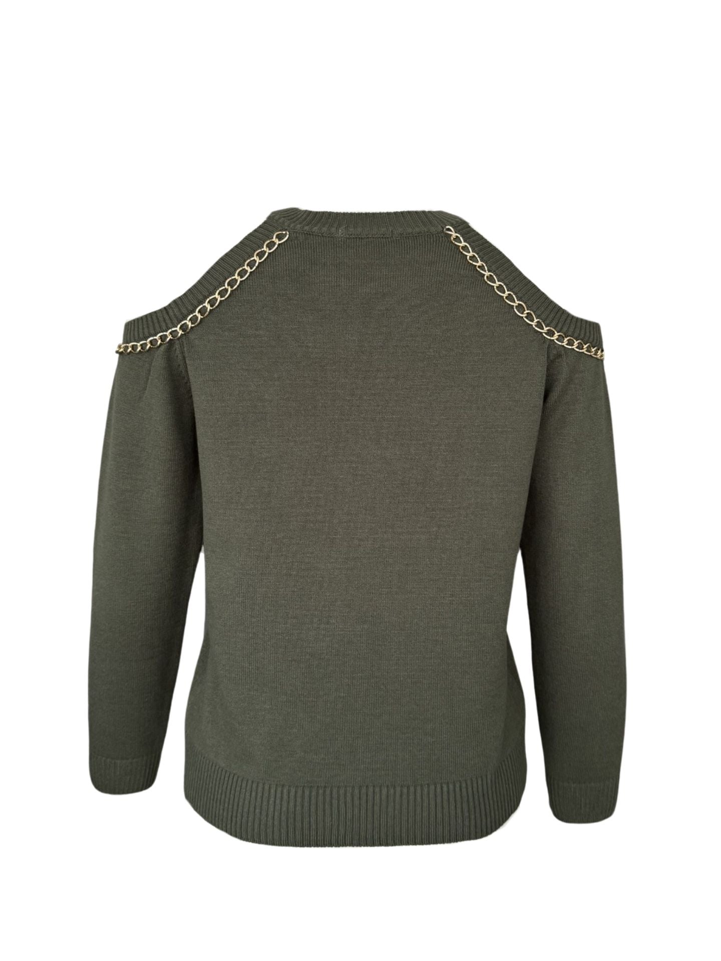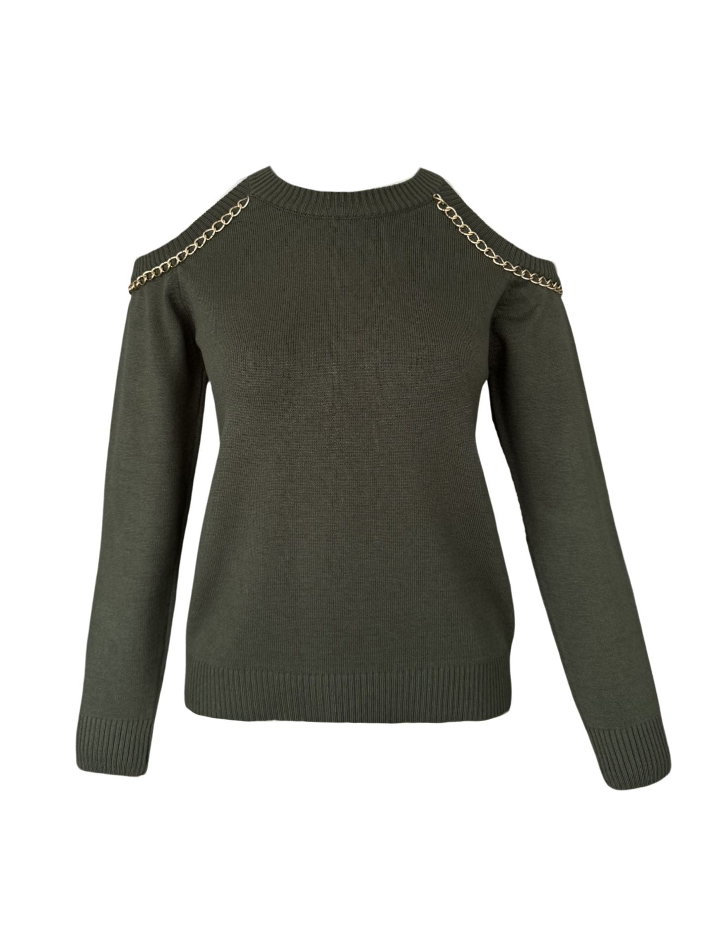 تفاصيل سلسلة انخفاض الكتف من الملابس المحبوكة باللون الكاكي
