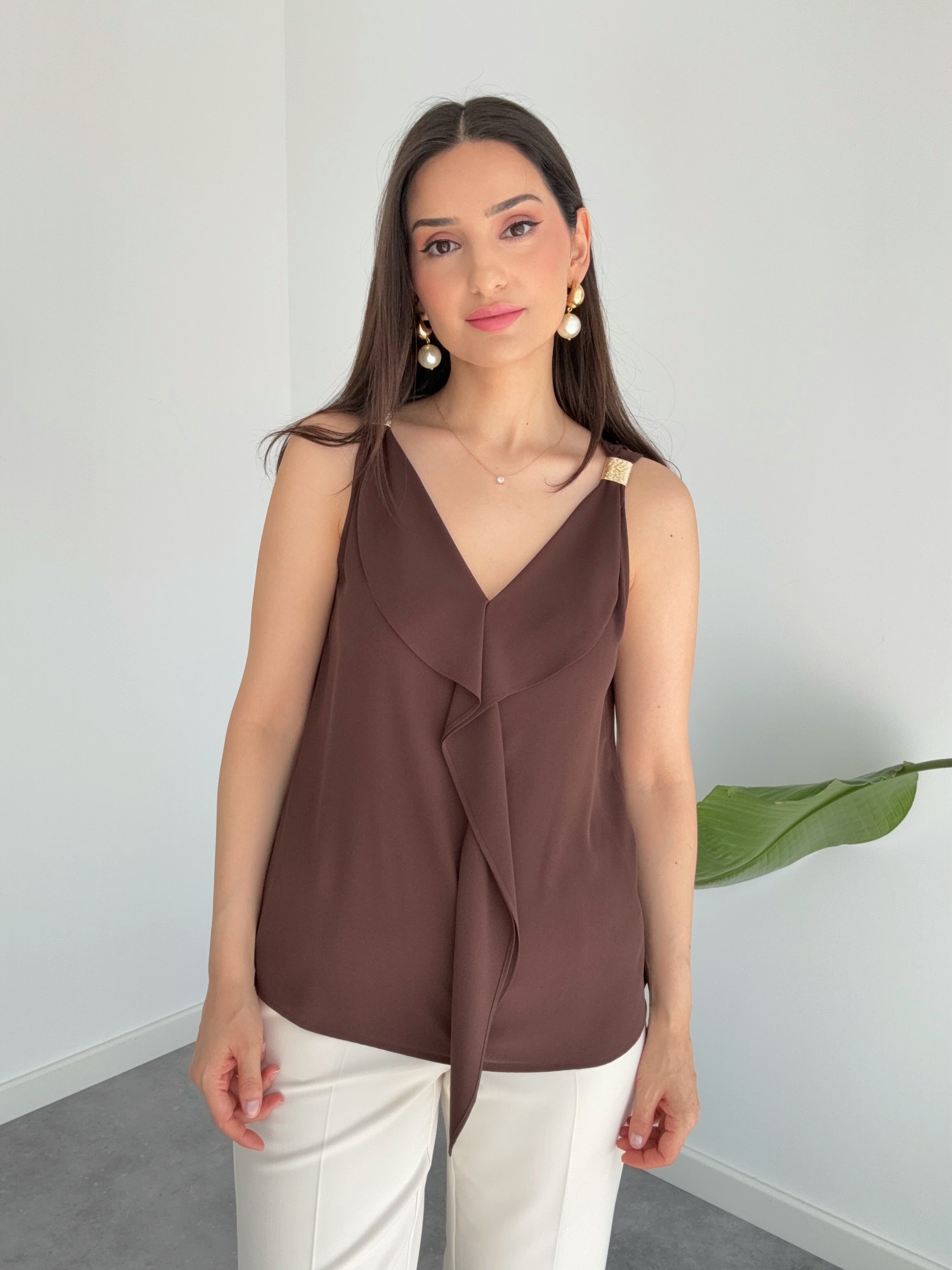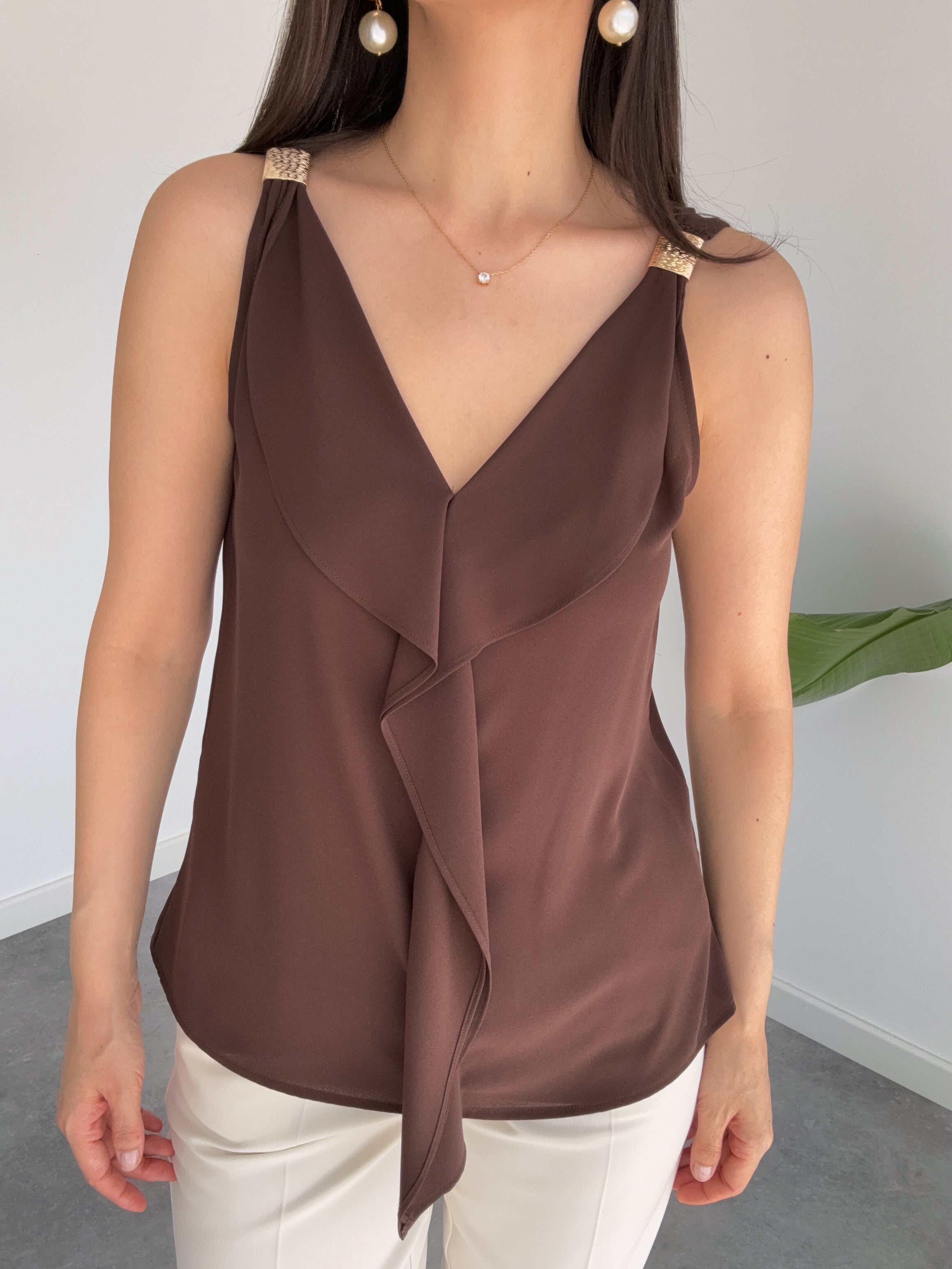 بلوزة بفتحة رقبة على شكل حرف V مع تفاصيل إكسسوار على الكتفين، لون بني