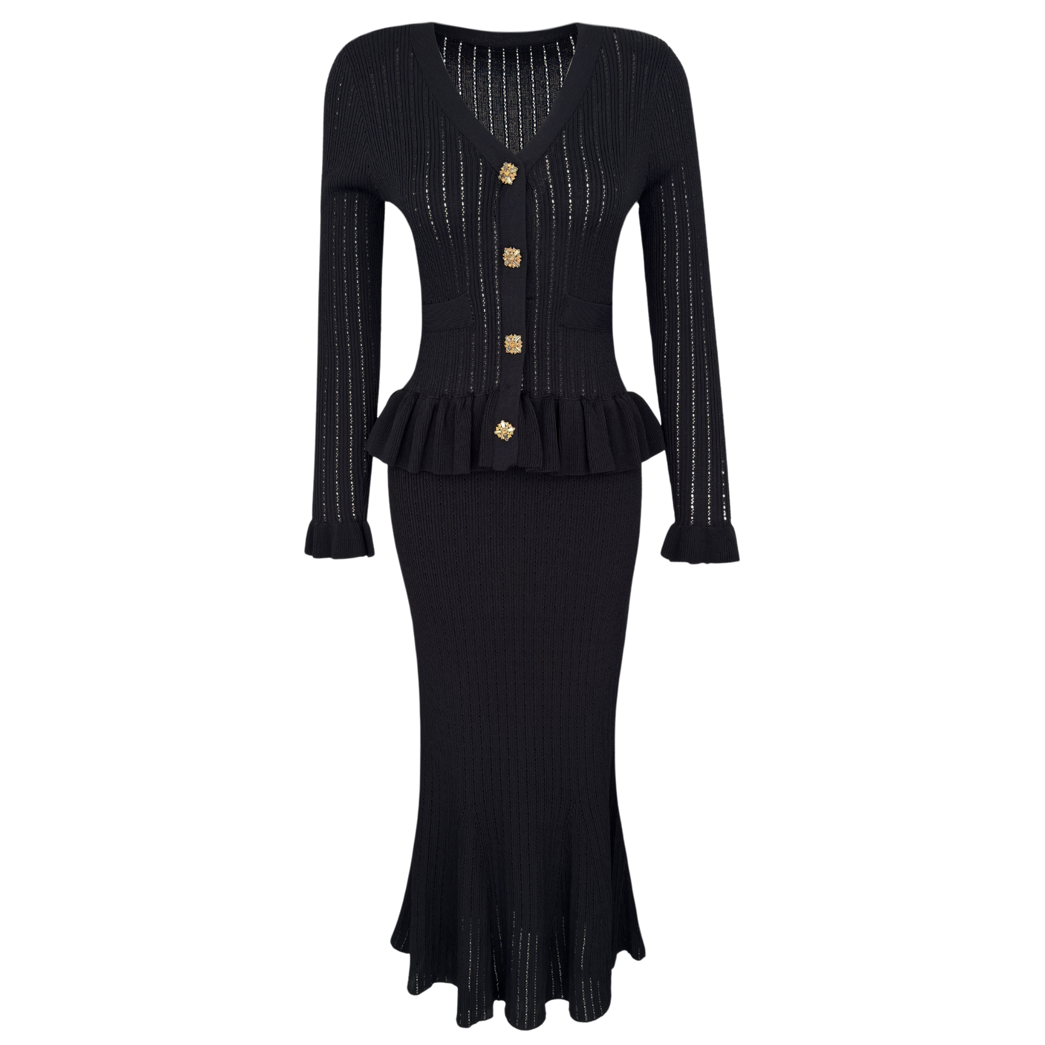 MERCERIZED KNIT DRESS WITH STONE BUTTON DETAIL AND RUFFLES, BLACK.