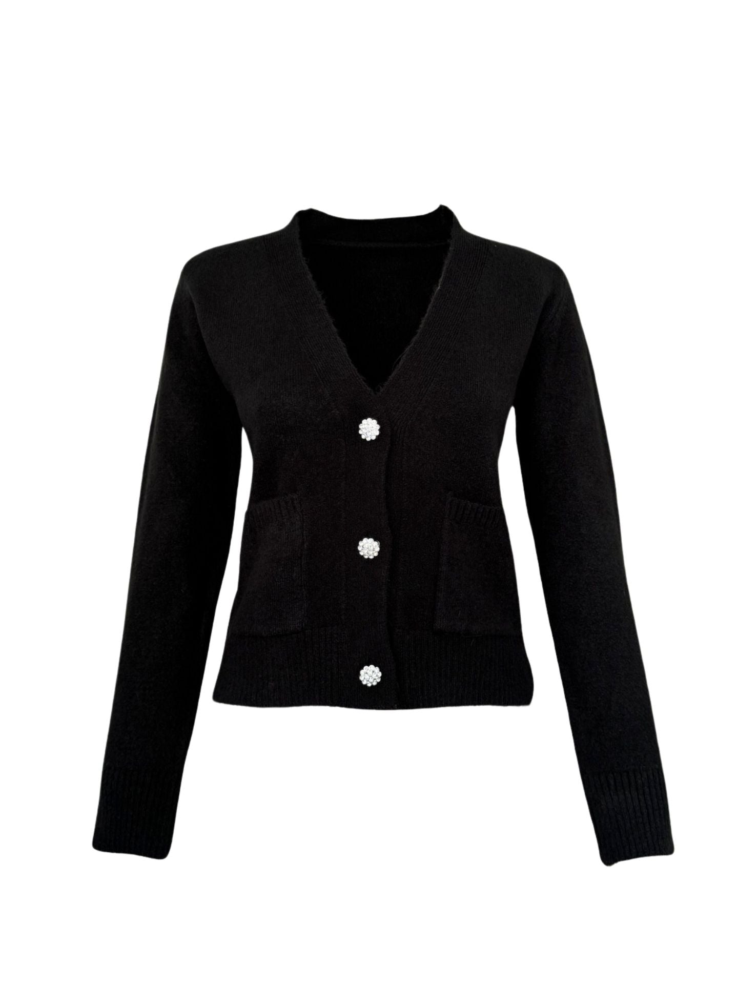 جاكيت تريكو أسود برقبة على شكل حرف V وأزرار حجرية