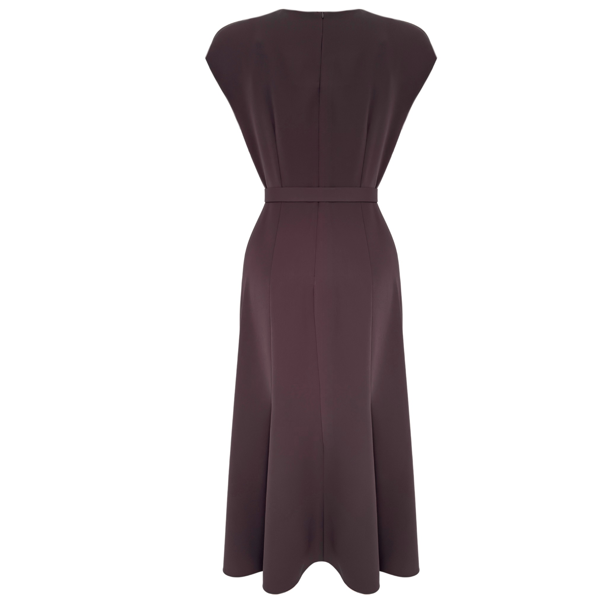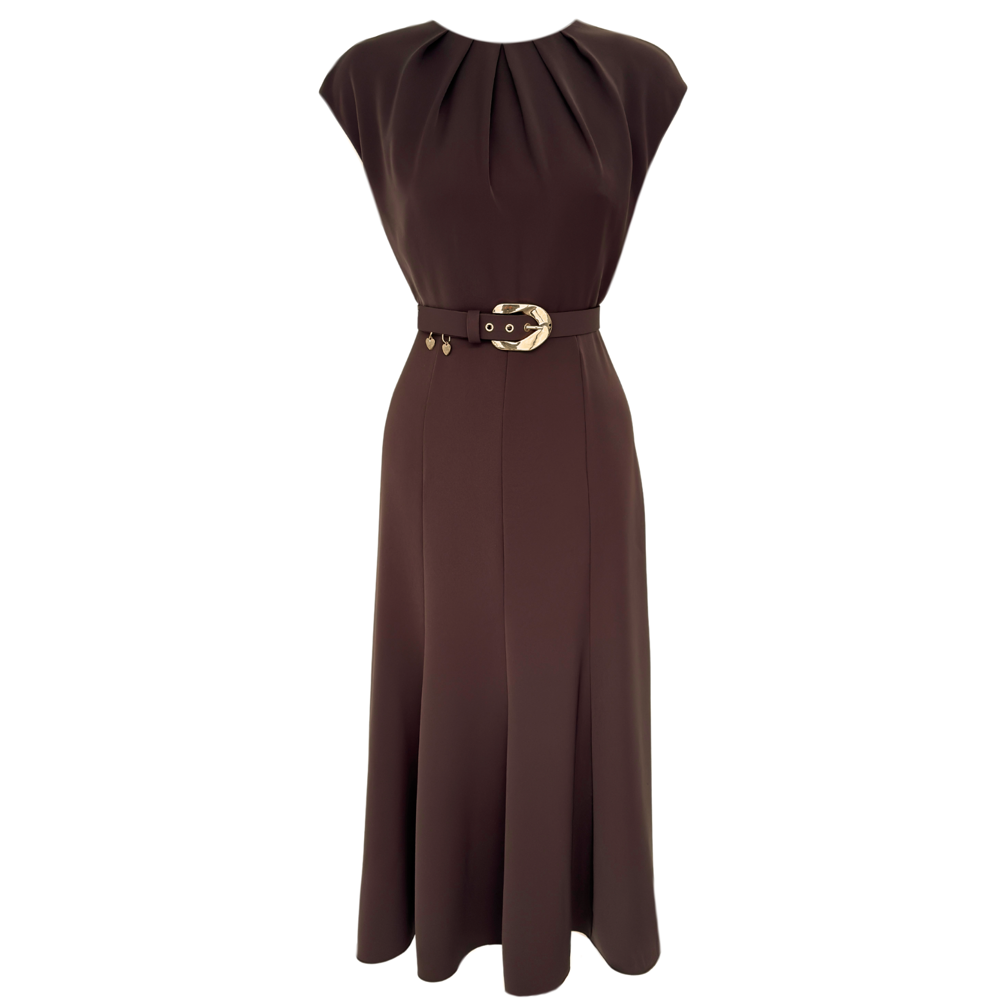 BROWN DRESS WITH PLEATED COLLAR AND BELT.