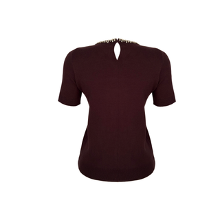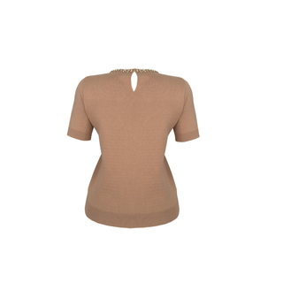 SHORT-SLEEVE KNITTED SWEATER WITH STONE EMBELLISHMENT ON THE COLLAR, DARK BROWN.