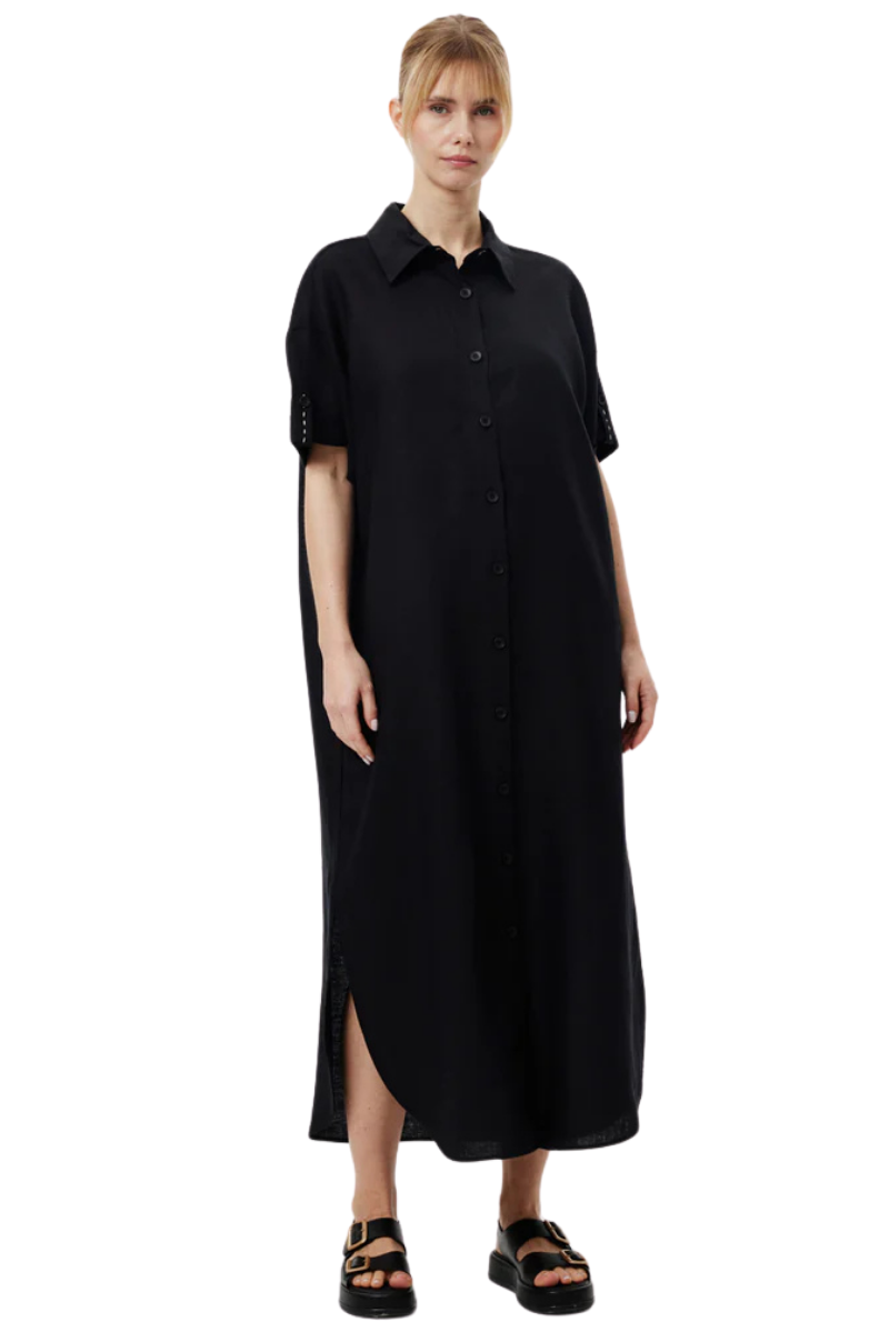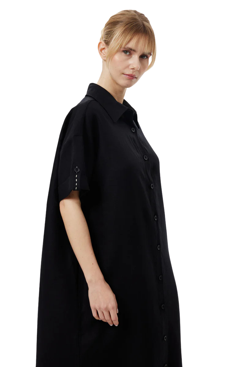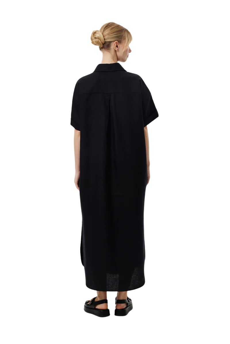 فستان قميص مريح من الكتان بنسبة 100% باللون الأسود