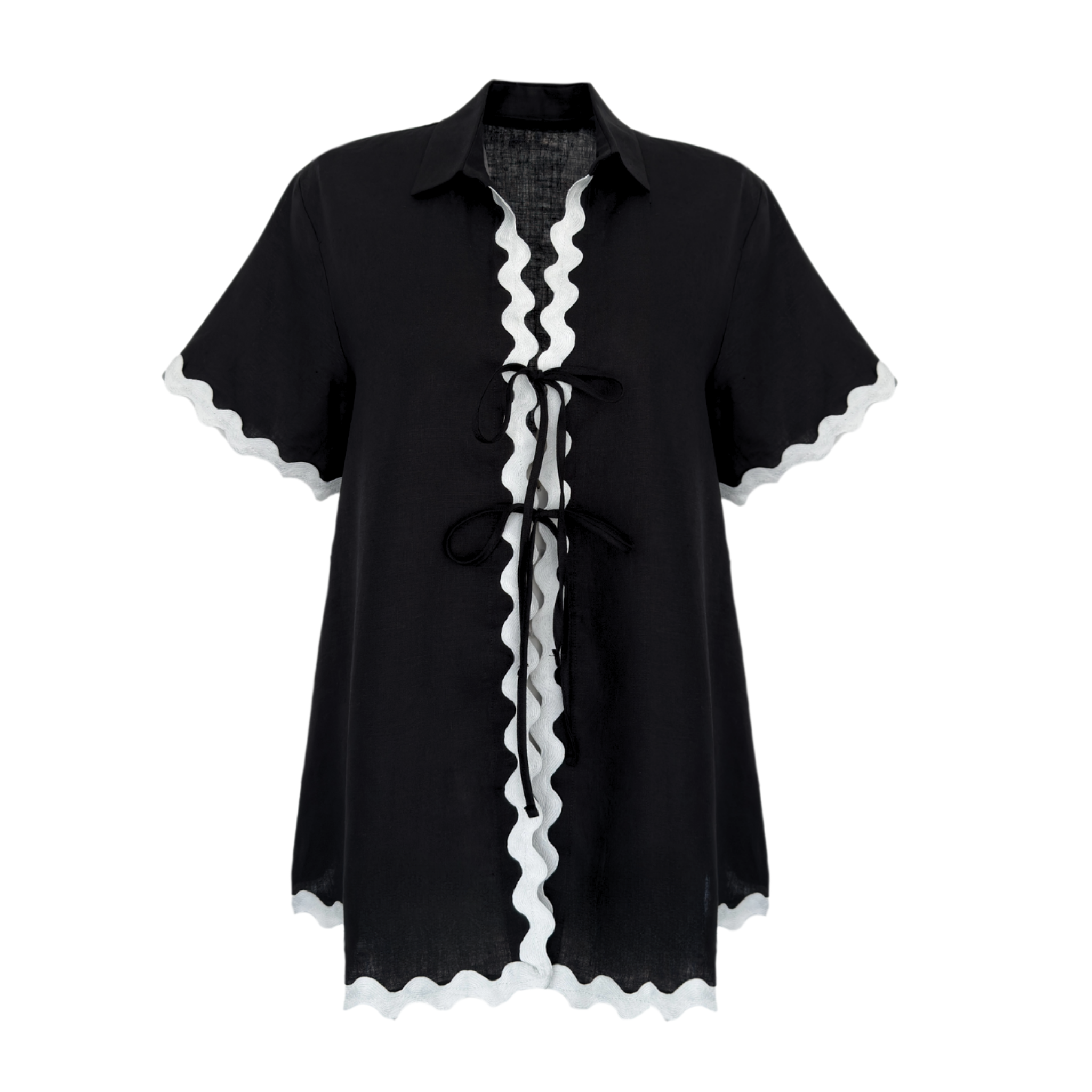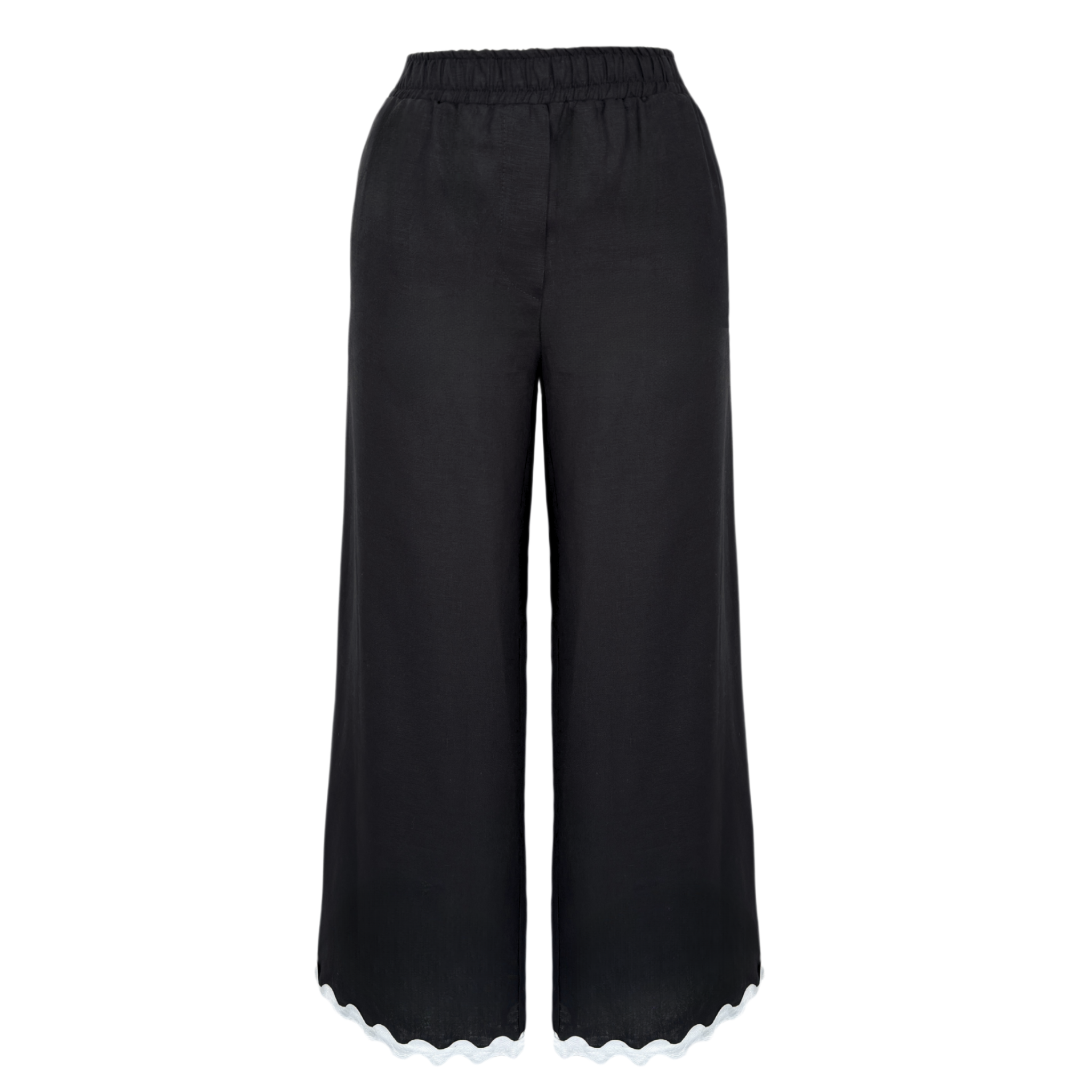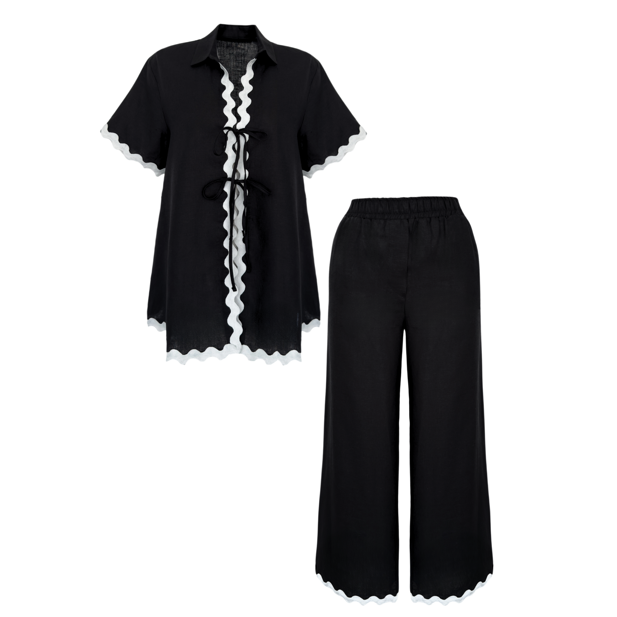 بدلة كتان 100% باللون الأسود مع تفاصيل خطوط متباينة