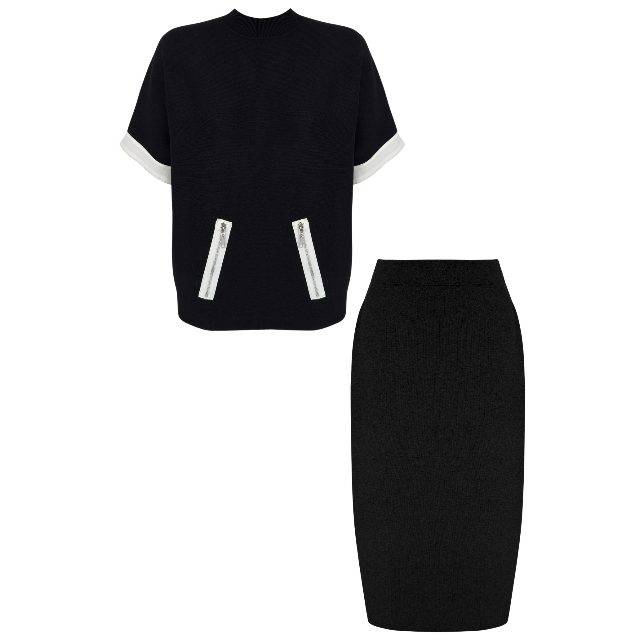 HIGH COLLAR SWEATER AND SKIRT KNIT SET, BLACK.